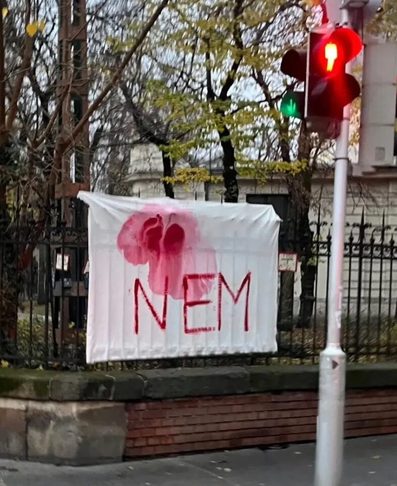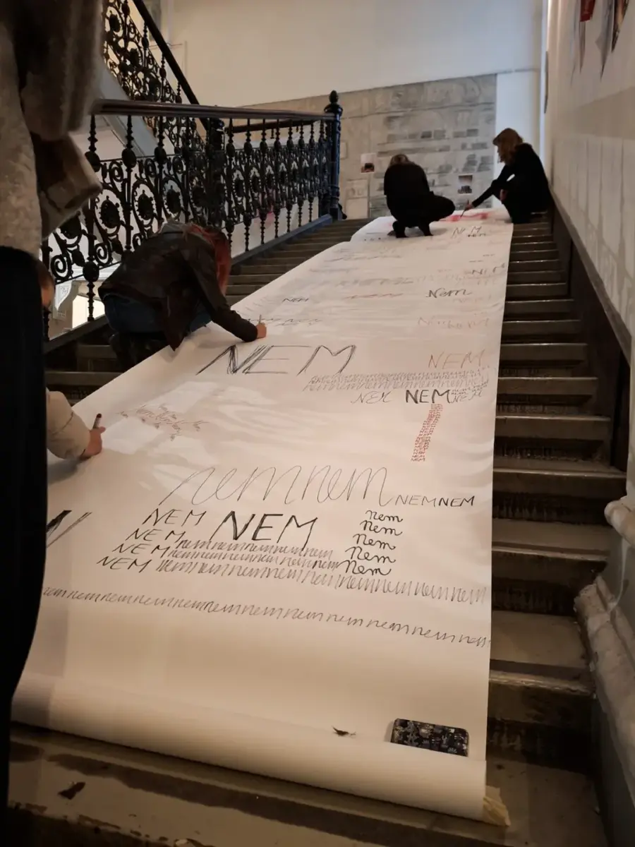 A napokban az intézmény másik épületének ablakában új mű jelent meg: ”NEM”, piros betűkkel. Kiáltás, gesztus és egy vizuális emlékeztető arra, hogy nem lehet elsétálni a történtek mellett. A hallgatók teszik azt, amit az egyetemnek kellett volna: emberséggel, felelősséggel reagálnak. „..milyen faramuci a magyar joggyakorlat. Hogy a sírás, hogy a könyörgés, hogy a »könyörgöm, kérlek hagyd abba, fáj, nem akarom« nem elég.” 2 Hány bizonyíték, hány jelzés, hány összetört élet szükséges ahhoz, hogy a rendszer – és benne az intézmények – végre felismerjék: a nem beleegyezés erőszak.