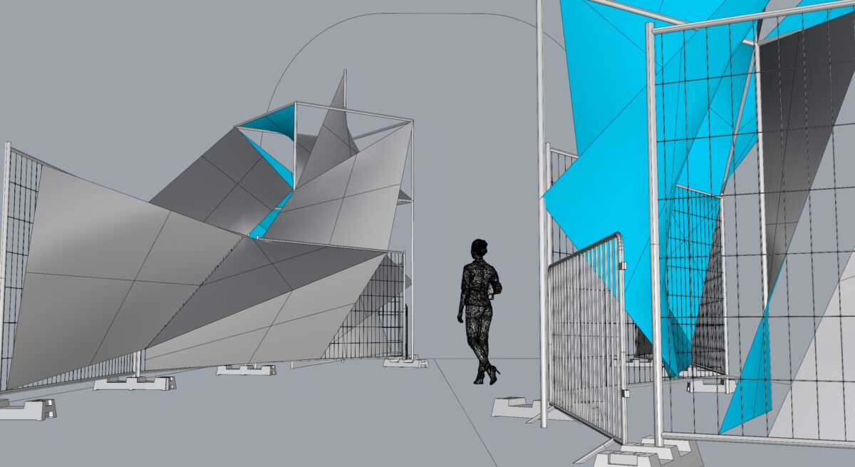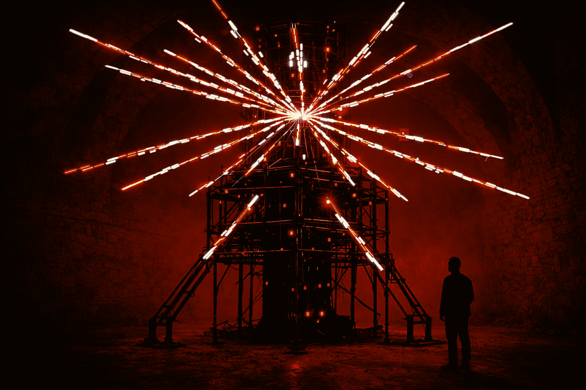 A DELTAEDER egy nagyléptékű, térbeli fényinstalláció egy hatméteres Layher állványtoronyba feszített, deltaéder-alapú geometriai szerkezetre épül. A tudatosan egyszerű, moduláris rendszer lehetővé teszi, hogy a munka különböző városi kontextusokban újraaktiválható formai struktúraként működjön.