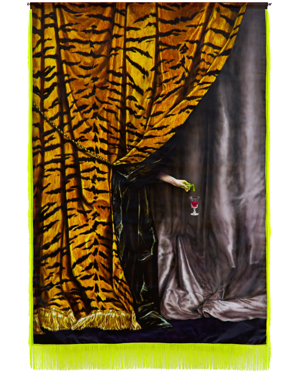 Lőrincz Áron Hidden Enemies című festménysorozata olyan rejtett, nehezen azonosítható fenyegetésekkel foglalkozik, amelyek jelenlétét érzékeljük, de pontos formájukat nem tudjuk megragadni – a vírusoktól az összeesküvés-elméletekig. Kompzícióin megszűnik a hagyományos előtér-háttér viszony, a néző egy olyan függönyszerű zárt felülettel találja szembe magát, amely azonnali, feszült vizuális helyzetet teremt. A figurák csupán részleteikben válnak láthatóvá, épp annyira, hogy helenlétük bizonyossá váljon. Hasonlóan a krimik visszatérő motívumaihoz, amikor egy cipőpár kilóg a függönyök alól.