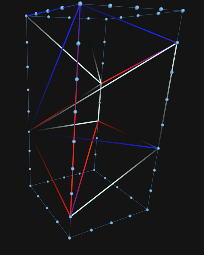 Az installáció kulcsa, hogy a testet nem felületek, hanem animált fényvonalak definiálják – a szem a mozgó élekből folyamatosan “hozza létre” azokat az elképzelt síkokat, amelyek fizikailag nem léteznek. Az animációk a ruled surfaces matematikai logikájára épülnek: a fáziseltolások, irányváltások és sebességkülönbségek csavart, egymásból generálódó lebegő felületek érzetét keltik. Így a forma hol szilárd testként, hol széteső struktúraként érzékelhető. A DELTAEDER észlelési helyzet, ahol a néző mozgása aktiválja a látványt, miközben a fény szerkezetet teremt, a forma pedig folyamatosan alakuló térélményt nyit meg.