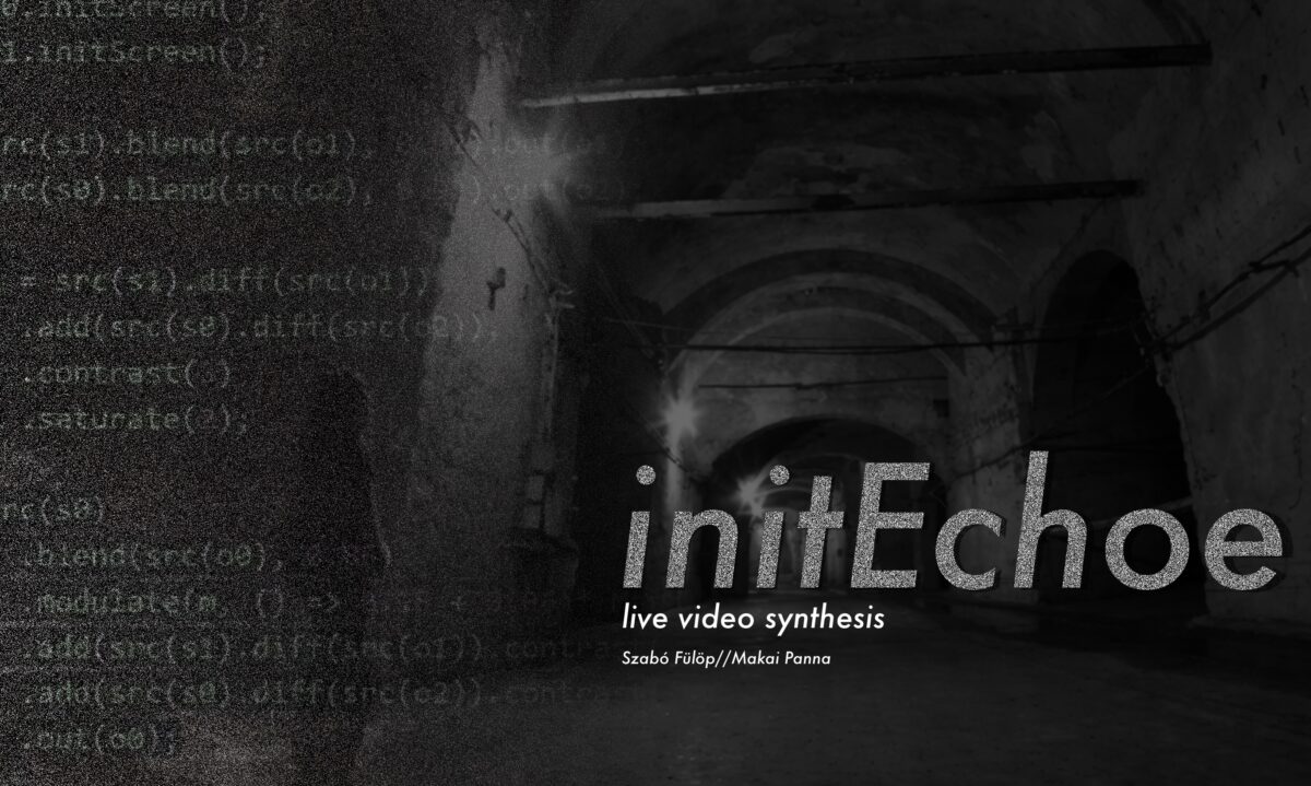 Az .initEchoe a hydra.ojack.xyz nyílt forráskódú, live-coding alapú vizuális szintetizátorára épülő, helyspecifikus kísérleti projekt, amelyben a rendszer valós időben fogad és alakít képi jeleket: rétegez, torzít, szűr és visszacsatolásokat hoz létre, miközben a paraméterek a környezethez igazodva élőben módosíthatók. A helyszín, vagyis a kőbányai pincerendszer közvetlenül beleépül a kompozícióba, ugyanis a generált képek a tér fényviszonyaihoz és adottságaihoz igazodnak, így maga a környezet alakítja a rétegek, torzítások és visszacsatolások működését.