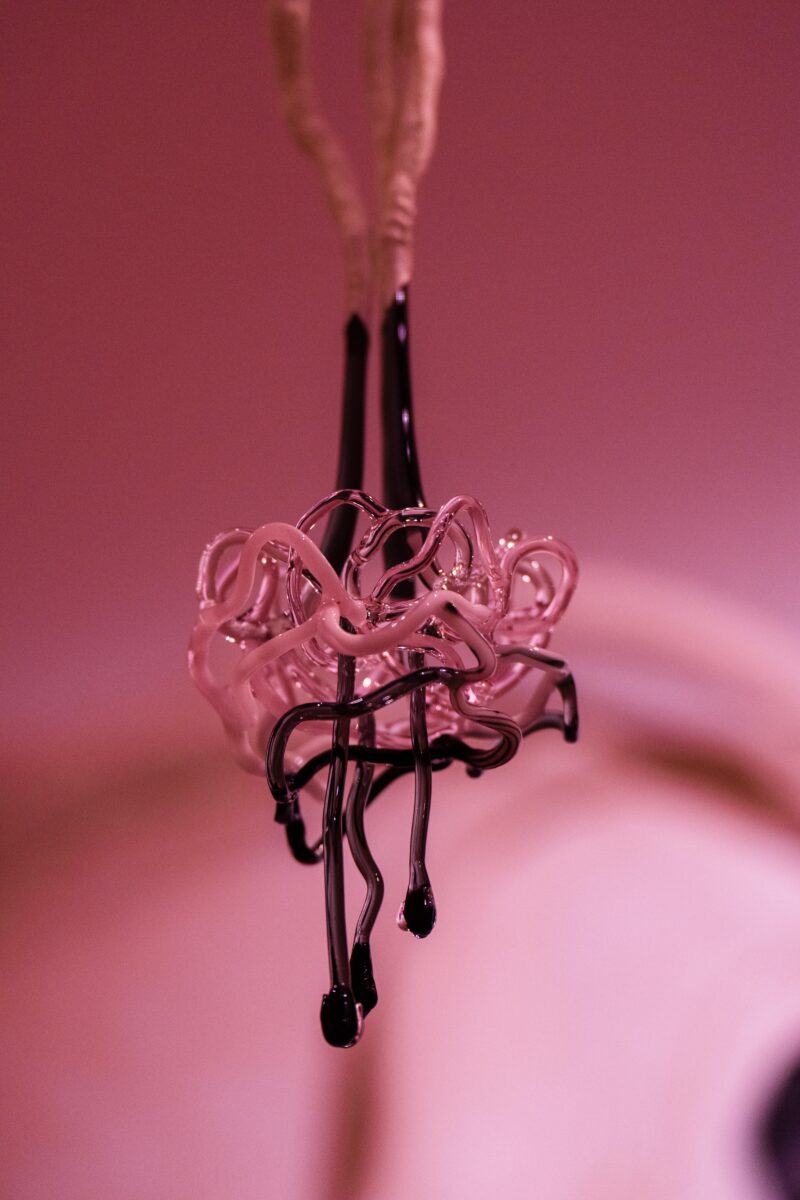 Metzing Eszter Speleothem (2024) című munkája boroszilikát üveg, latex, pamutvászon, pamutcérna és vatelin felhasználásával létrehozott, változó méretű installáció. A cím a barlangi képződményekre utal: a speleothem a barlangokban a vízből kiváló ásványi anyagok lerakódásával kialakuló szerkezet, például cseppkő vagy cseppkőoszlop. Az anyaghasználat az organikus növekedés és a mesterséges struktúrák közötti átmenetet vizsgálja. Az áttetsző és puha, ugyanakkor feszülő és sérülékeny anyagok egymás mellé rendelése a természetes folyamatok és az emberi beavatkozás viszonyát tematizálja, miközben a képződés, a rétegződés és az időbeliség kérdéseit is előtérbe helyezi.