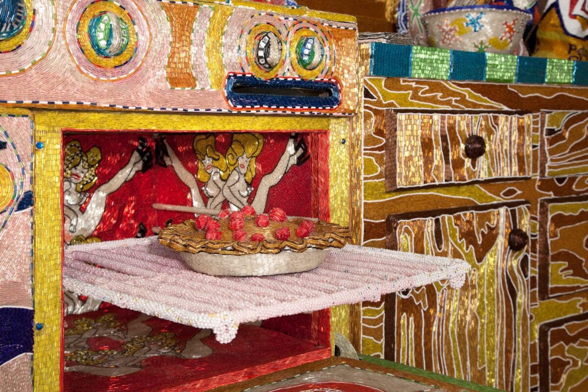 Liza Lou, Kitchen, 1991-1996, üveggyöngyök, fa, drót, gipsz és művészek által használt applikátorok, 15,6 m2 (részlet)