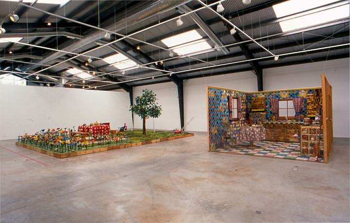 Liza Lou, Kitchen, 1991-1996; háttérben Liza Lou, Backyard, 1996-1999, üveggyöngyök, flitterek, fa, drót, gipsz, talált tárgyak, 670,6 x 731,5